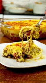 4. Num refratário, adicione a carne moída,em seguida o creme de milho e por último o queijo por cima.