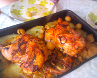 Enquanto isso, em uma assadeira, coloque as batatas fatiadas e as batatas bolinhas.