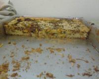 Depois de untar uma forma, coloque a metade da massa. Recheie e coloque o restante. Leve ao forno até dourar.